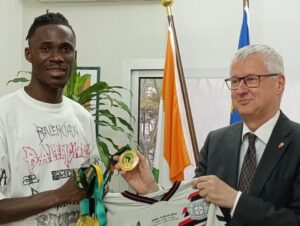 Lors de cette rencontre, Odilon Kossounou a partagé ses médailles, dont la médaille d’or remportée lors de la CAN 2023, et a offert un maillot du Bayer 04 Leverkusen à l’Ambassadeur.