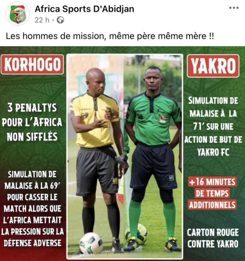L’Amicale des Arbitres de Football de Côte d’Ivoire (AMAFCI) a annoncé son intention de poursuivre en justice les administrateurs des pages Facebook “Africa Sports d’Abidjan” et “Informations sur le Football Ivoirien (Africain)” pour diffamation, fausses accusations, et incitation à la haine contre des arbitres en mission.