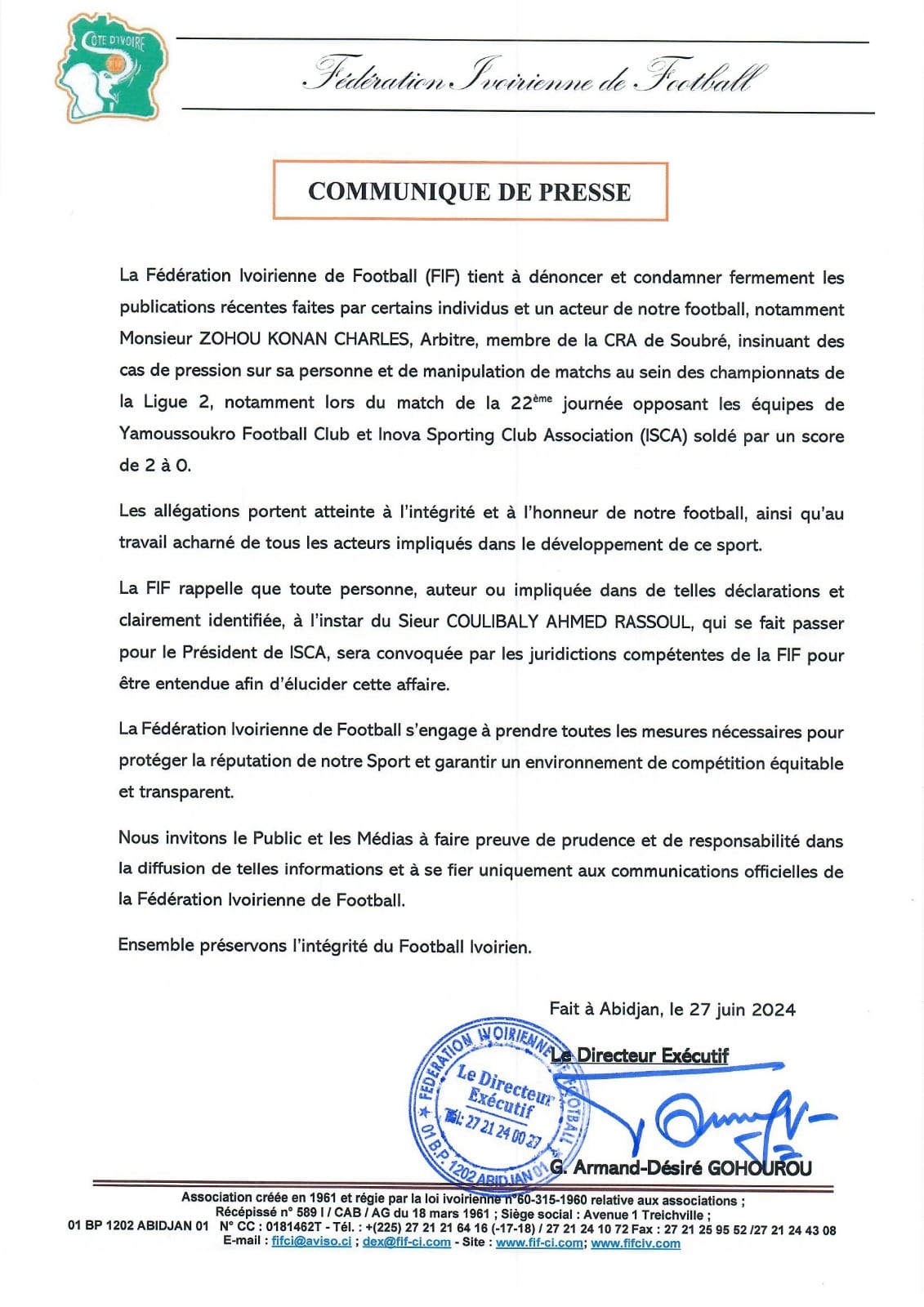 La Fédération Ivoirienne de Football (FIF) condamne vigoureusement les récentes déclarations de certains acteurs du football, notamment celles attribuées à COULIBALY AHMED RASSOUL au titre de président de l’ISCA.