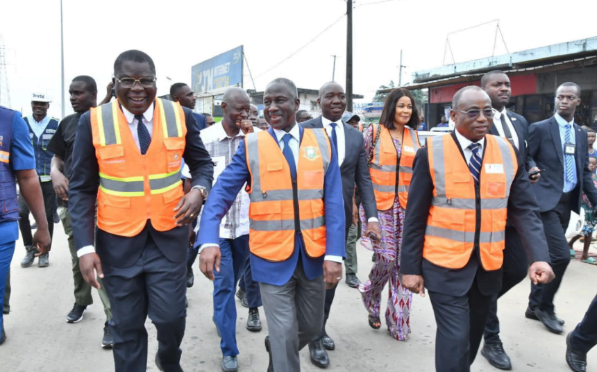 Le Ministre de l’Équipement et de l’Entretien Routier, Dr Amédé Koffi KOUAKOU, a effectué en compagnie du Ministre Koffi N’GUESSAN de l’Enseignement Technique, de la Formation Professionnelle et de l’Apprentissage, une visite sur les travaux de renforcement et d’élargissement de la voie de liaison entre le Carrefour Sable et la Route Dabou.
