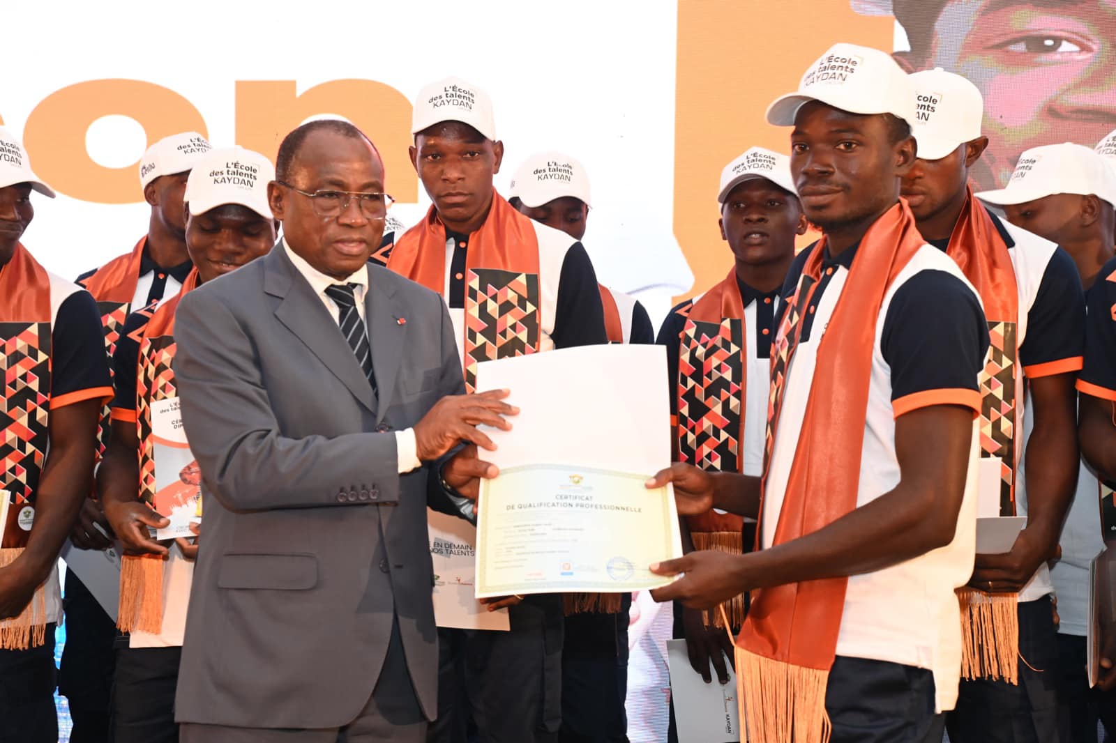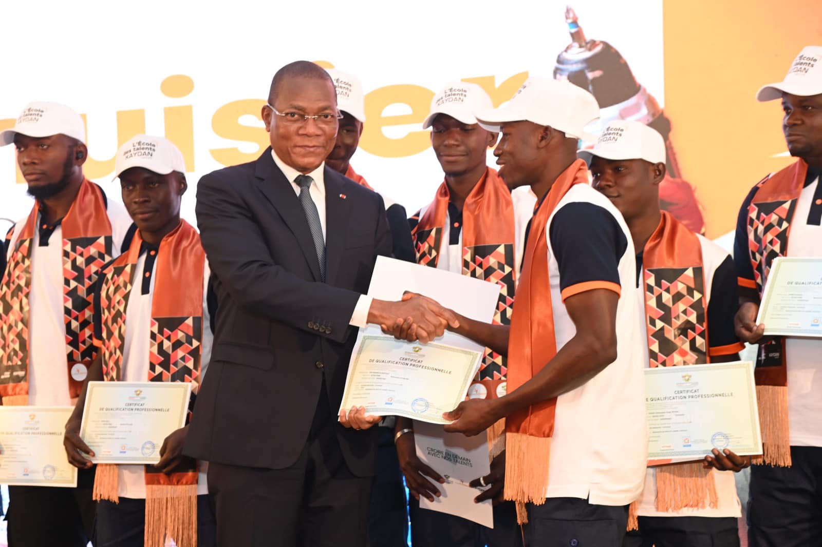 Ce sont ces mêmes objectifs que poursuit la convention de partenariat signée le 4 mai 2023 entre Kaydan Groupe et le Ministère de l’Enseignement Technique, de la Formation Professionnelle et de l’Apprentissage. Kaydan Groupe, entreprise spécialisée entre autres dans le bâtiment, a offert aux jeunes sélectionnés pour le programme, la possibilité d’apprendre un métier et, de ce fait, de disposer de compétences dont le monde professionnel a besoin. Je voudrais saluer le Président de Kaydan Groupe,  monsieur Alain Kouadio et le féliciter pour son professionnalisme, ainsi que pour son style de management gagnant. Il a su, avec clairvoyance, s’entourer de cadres talentueux qui font la fierté de notre pays. La convention de partenariat que nous avons signée en mai 2023 , traduit aussi leur esprit patriotique. Dans ce sens, Kaydan Groupe a, non seulement assuré les formations, mais a, aussi, supporté entièrement toutes les charges financières à hauteur de plus de 450 millions de FCFA. ».