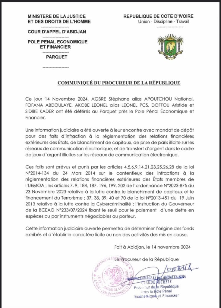 Ce Jeudi 14 novembre 2024, cinq individus, à savoir AGBRE Stéphane alias APOUTCHOU National, FOFANA ABDOULAYE, AKOBE LEONEL alias LEONEL PCS, DOFFOU Aristide et SIDIBE KADER, ont été déférés au Parquet près le Pôle Pénal Économique et Financier.