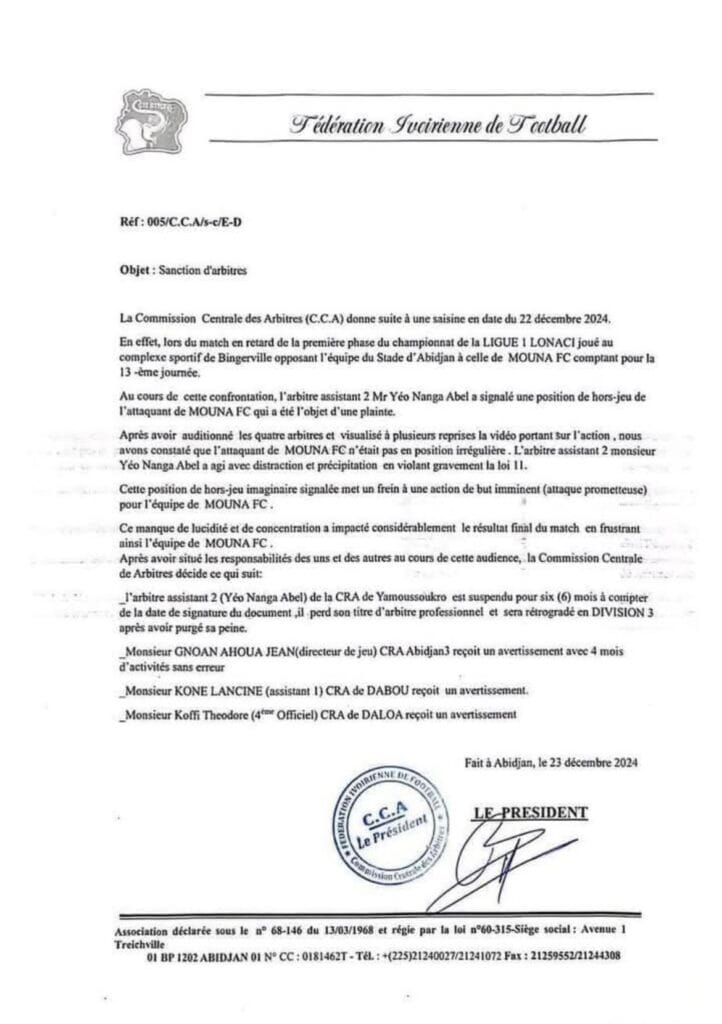 La Fédération Ivoirienne de Football (FIF) informe l’opinion publique que l’arbitre Abel Nanga Yéo a été suspendu pour une durée de six (6) mois en raison de comportements contraires à l’éthique et à la déontologie de l’arbitrage.