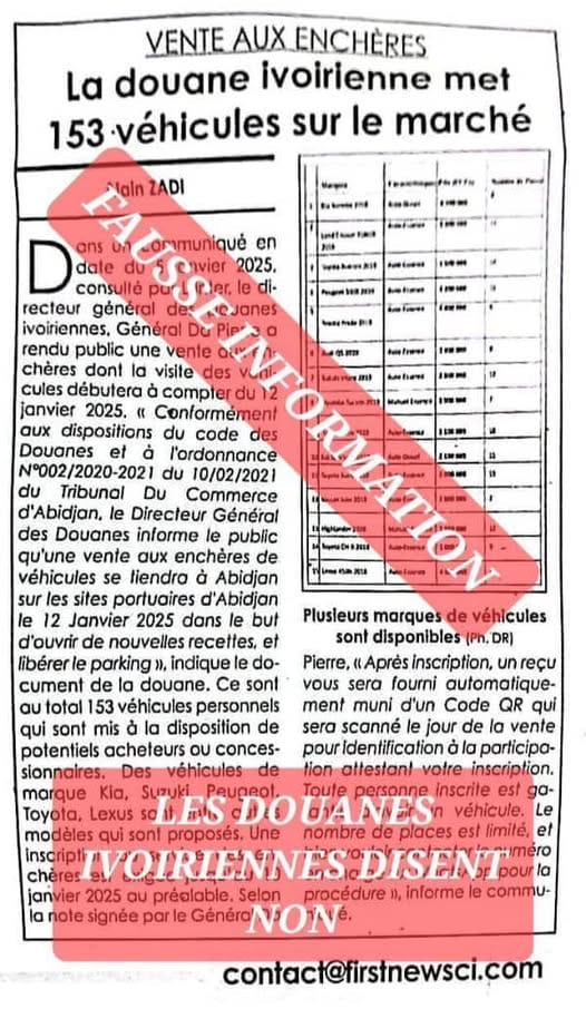 Les Douanes Ivoiriennes alertent le public sur une fausse information publiée dans le journal L’Inter du 7 janvier 2025, mentionnant une vente aux enchères de véhicules. Elles précisent qu’aucune vente de ce type n’est prévue par leurs services.