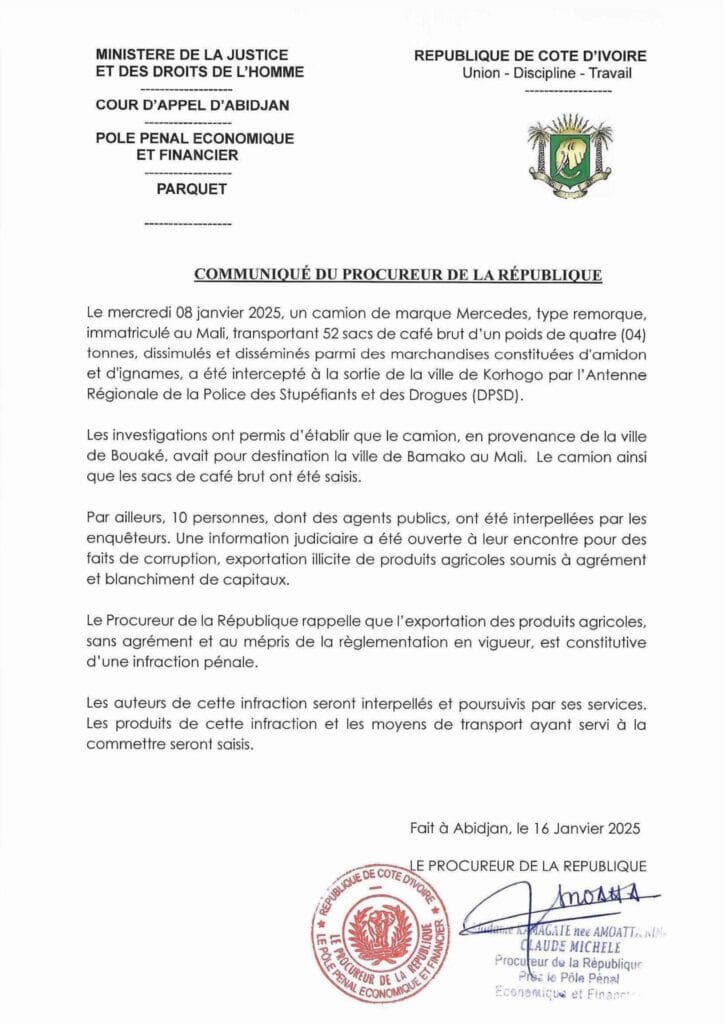 Le mercredi 08 janvier 2025, un camion de marque Mercedes, type remorque, immatriculé au Mali, transportant 52 sacs de café brut d’un poids de quatre (04) tonnes, dissimulés et disséminés parmi des marchandises constituées d’amidon et d’ignames, a été intercepté à la sortie de la ville de Korhogo par l’Antenne Régionale de la Police des Stupéfiants et des Drogues (DPSD).