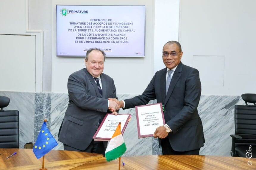 Abidjan, le 17 janvier 2025 – La Salle C de la Primature a abrité, le jeudi 16 janvier 2025, une cérémonie de signature de deux accords de financement d’une valeur de 200 millions d’euros, (131 milliards de FCFA) entre l’Etat de Côte d’Ivoire, représenté par le ministre des Finances et du Budget, Adama Coulibaly, et la Banque Européenne d’Investissement (BEI), représentée par son Vice-président, Ambroise Fayolle.