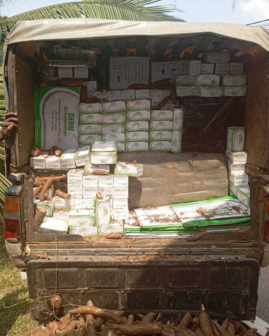 Ce pickup bâché, habituellement utilisé pour transporter du manioc, dissimulait un contenu illicite sous sa cargaison.