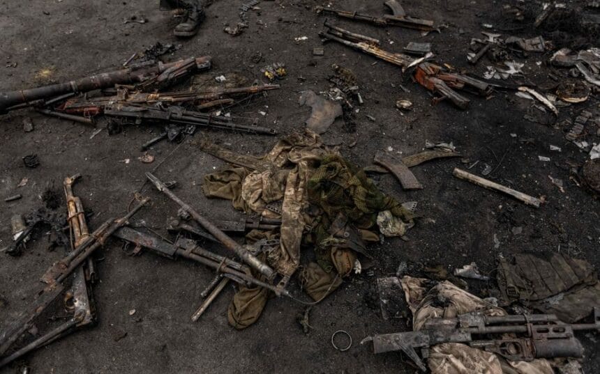 Weapons and military attire lie abandoned and burned on the ground in Goma on January 28, 2025. Intense fighting has left bodies in the streets and overwhelmed hospitals in the besieged DR Congo city of Goma, the United Nations said on January 28, 2025, as protesters furious about international inaction attacked embassies in the country's capital. (Photo by AFP)