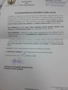 Le Département d’État américain, par le biais de l’ambassade des États-Unis à Accra, a officiellement émis une demande d’extradition. Celle-ci repose sur un acte d’accusation datant de mai 2023, délivré par le tribunal de district du sud de New York.
