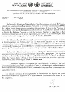Cette décision fait suite à une communication introduite le 21 juillet 2025 par Laurent Gbagbo, enregistrée sous le numéro 4825/2025. Le dossier, désormais porté devant les instances internationales, oblige Abidjan à répondre. La Côte d’Ivoire dispose d’un délai de six mois, soit jusqu’au 20 février 2026, pour transmettre ses observations et arguments au Haut-Commissariat des Nations Unies aux droits de l’homme, à Genève.