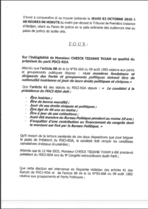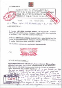 Le 12 mai 2025, Cheick Tidiane Thiam a été élu président du PDCI-RDA lors d’un congrès controversé. Cependant, ce processus est aujourd’hui au cœur d’une bataille judiciaire qui remet en question sa légitimité. Mey Jean Charles Thomas et Gba Golo Patrick, tous deux membres influents du parti, ont introduit un recours en justice pour annuler l’élection. Leur argument : des violations graves des statuts du PDCI-RDA et des lois ivoiriennes.