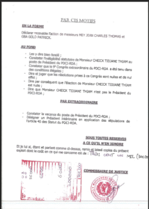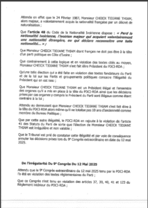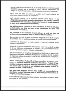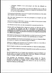 Mais ce n’est pas tout : les requérants pointent également des irrégularités majeures dans l’organisation du congrès. L’absence d’une convention d’investiture formelle, l’irrégularité de la liste des délégués, et surtout, le fait que le bureau du congrès n’a même pas été élu conformément aux statuts du parti, sont autant de violations qui jettent un doute sur la validité de l’élection.